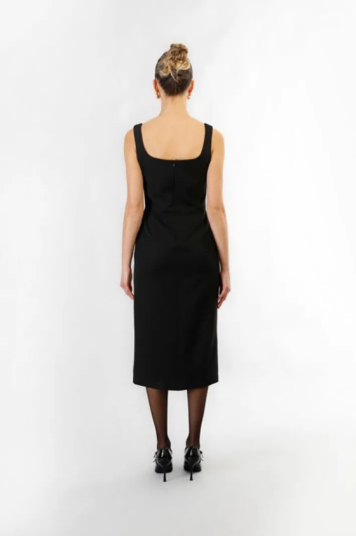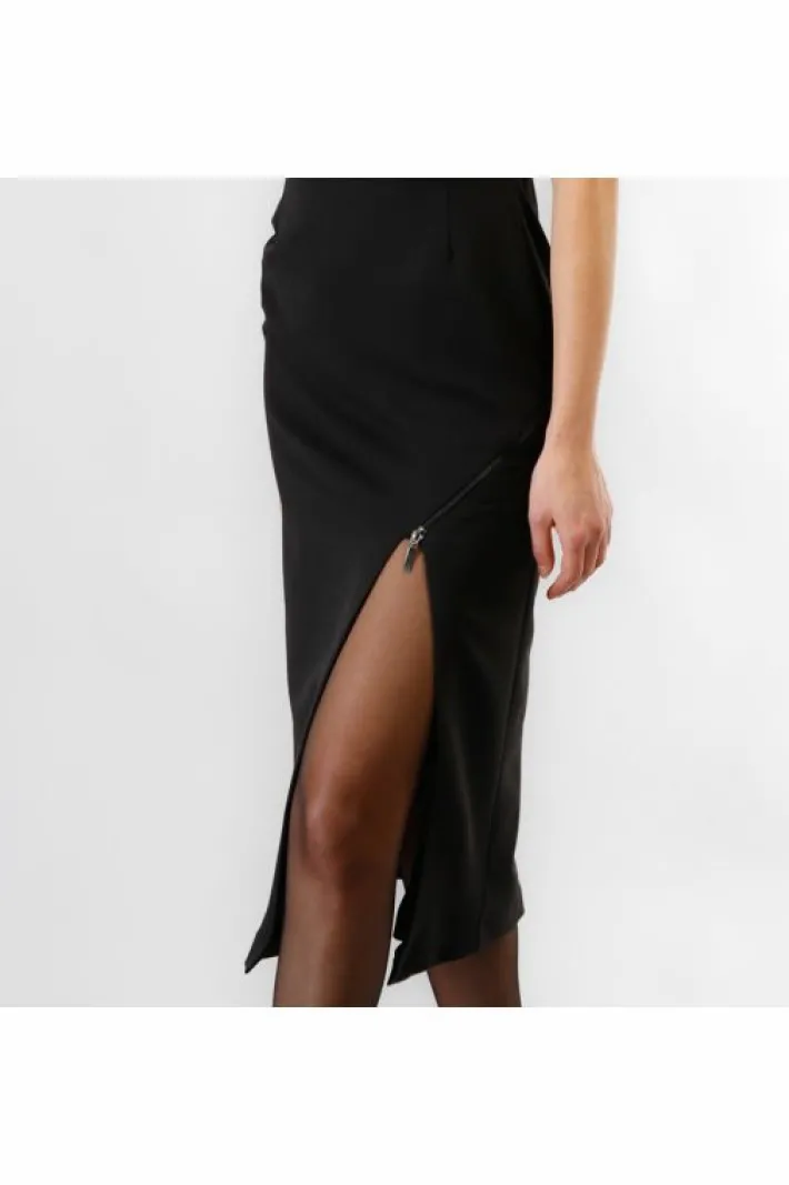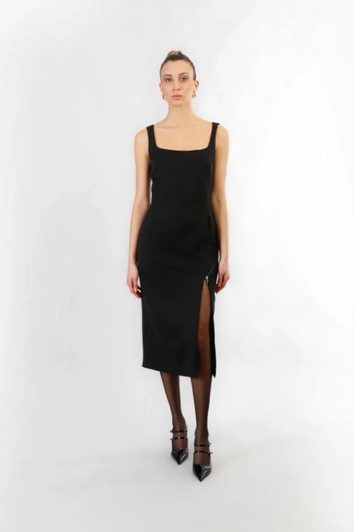 Abito longuette smanicato e con scollatura quadrata realizzato in tessuto poliviscosa. modello iperfemminile con importante spacco laterale e zip obliqua decorativa. chiusura con zip invisibile sul retro. abito elegante da indossare in occasioni speciali come un party o una cena. si consiglia di abbinarlo a décolleté con tacco alto.