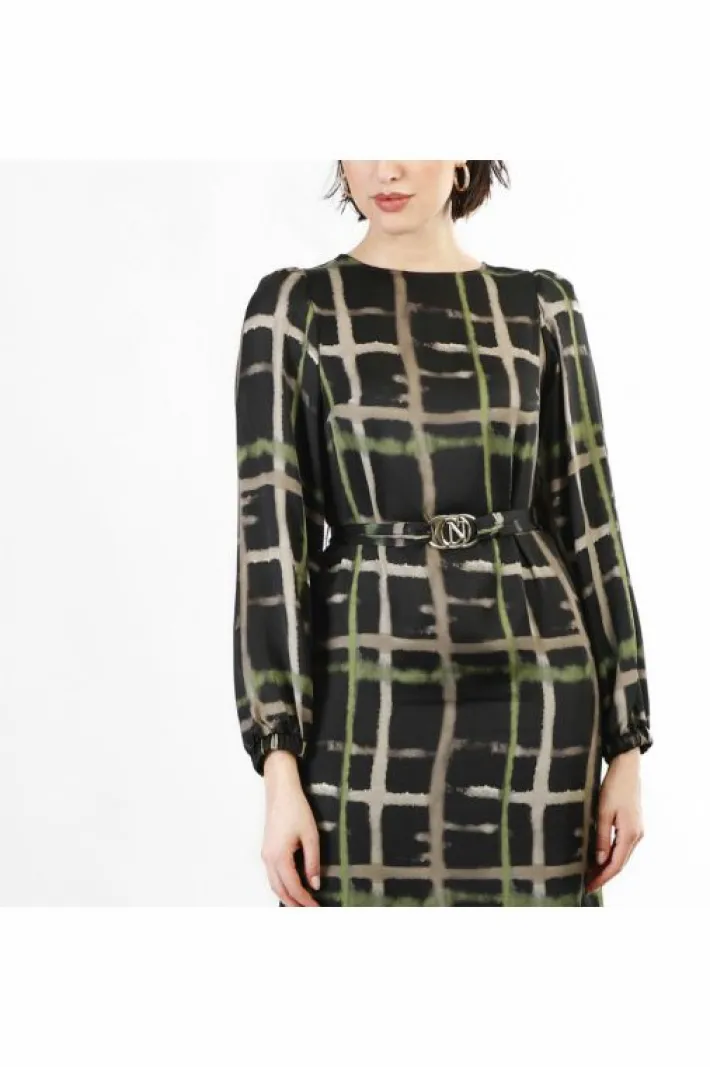Abito dalla linea dritta in viscosa stampata. maniche lunghe morbide con bottoni sui polsi. delineato il punto vita grazie alla fusciacca in tessuto con fibbia logata cafènoir. chiusura con zip invisibile sul retro.