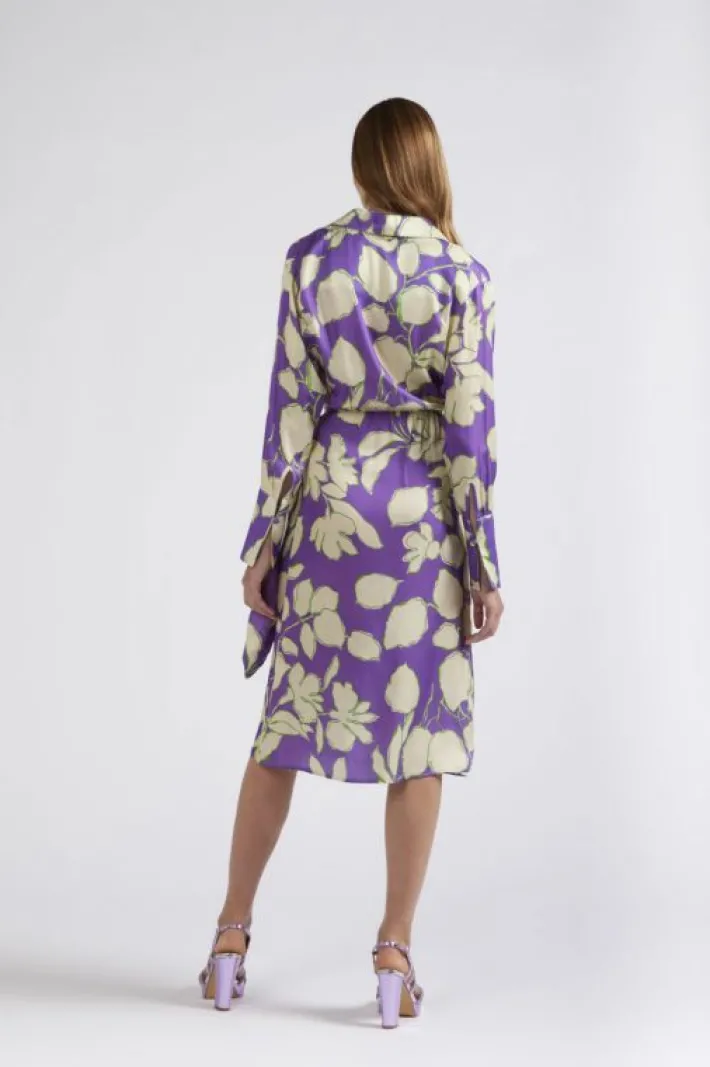 Elegante abito portafoglioo con maniche lunghe realizzato in un leggero satin di viscosa stampata. collo a “v”. abito perfetto per un look da cerimonia.
