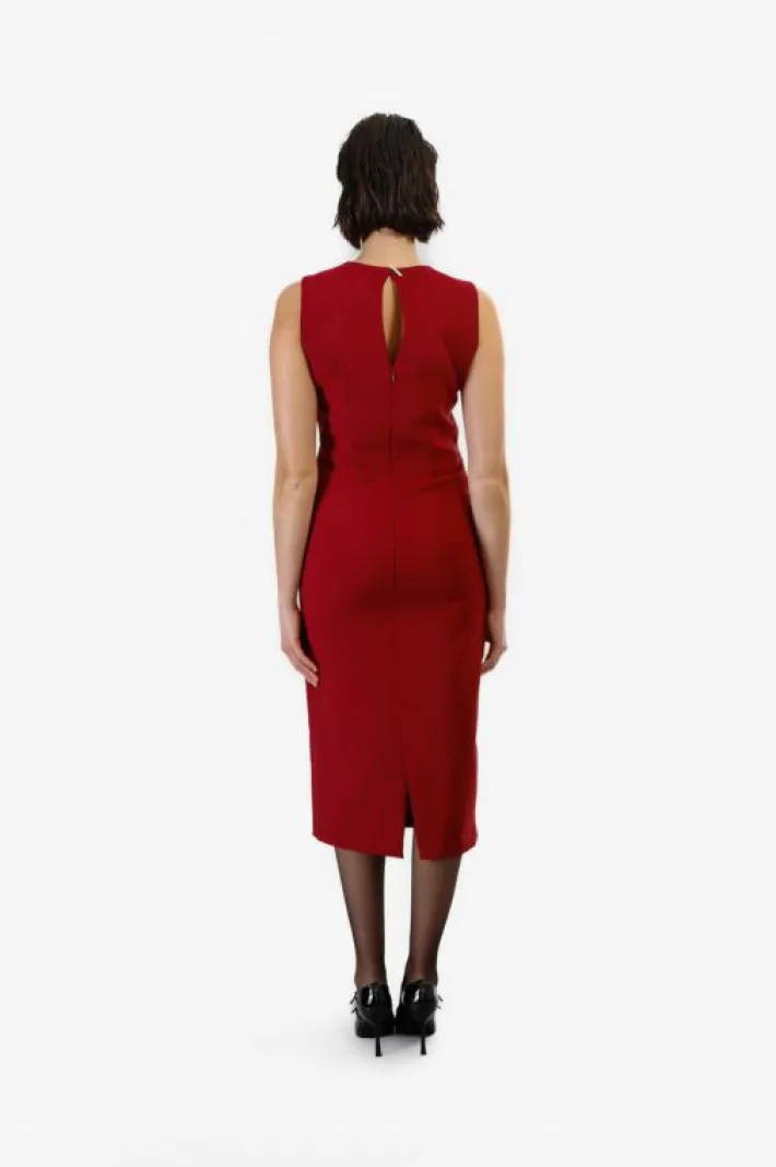 Abito girocollo modello tubino lunghezza sotto il ginocchio.l’abito è smanicato e realizzato in tessuto bistretch. sul retro è presente un’apertura a goccia con accessorio dorato e chiusura posteriore tramite zip a scomparsa. piccolo spacco posteriore centrale. il capo ha un vestibilità aderente che valorizza la silhuoette perfetto per l’ufficio.