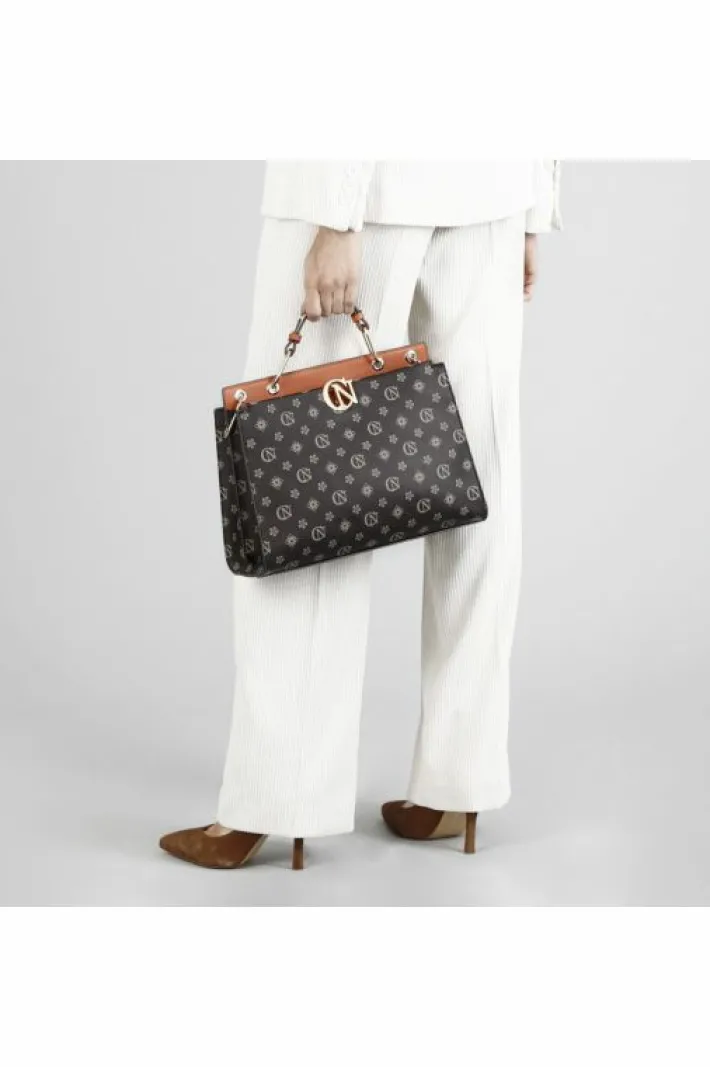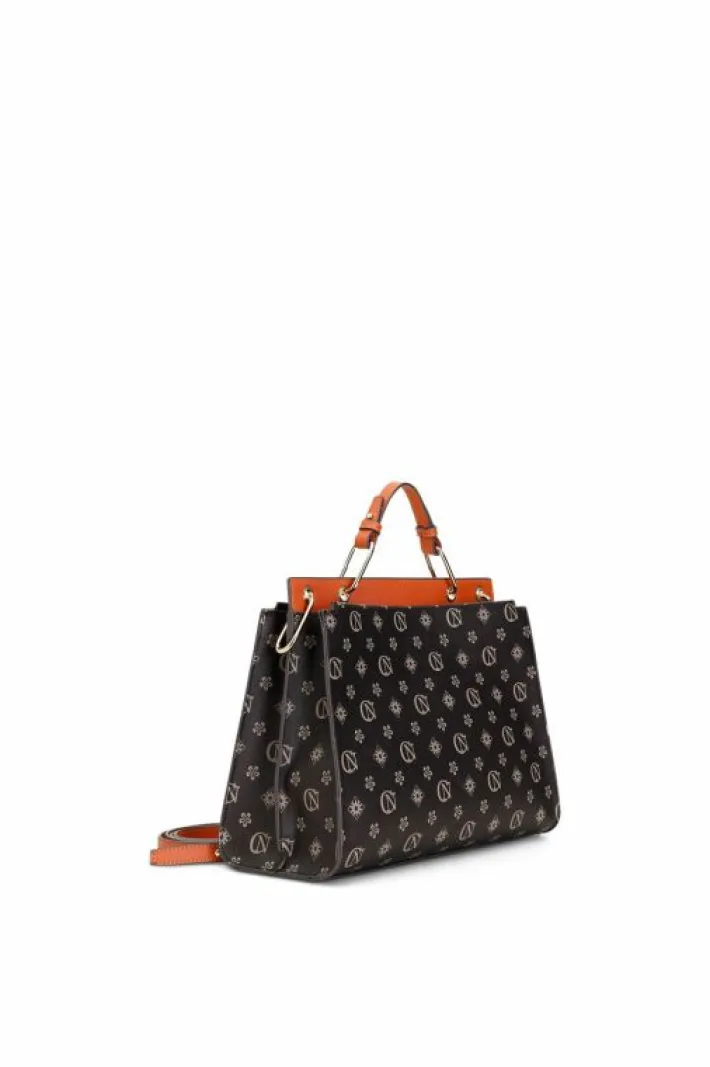 Bauletto in materiale effetto saffiano con stampa logata floreale all over, tramezza e manici in colore a contrasto e accessorio CafèNoir a incastro sul quadrante anteriore
