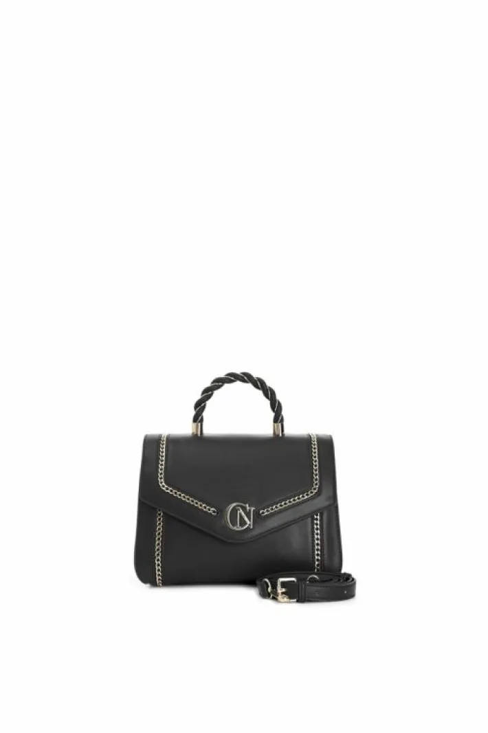 Borsa a mano con applicazione di catena in metallo dorato e logo cafènoir. manico in metallo con tubo. chiusura con calamita. tracolla removibile.