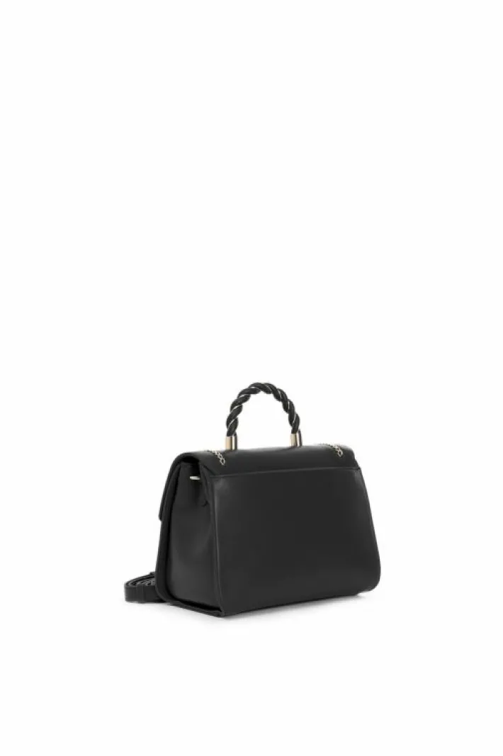 Borsa a mano con applicazione di catena in metallo dorato e logo cafènoir. manico in metallo con tubo. chiusura con cal…
