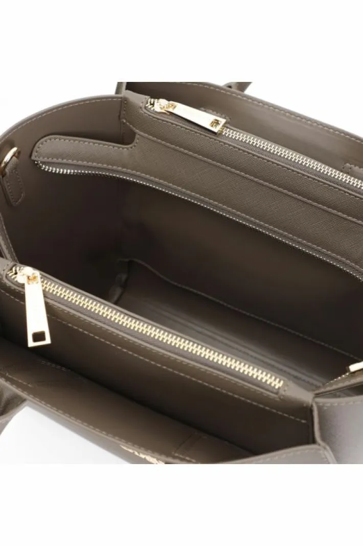 Borsa a mano dalla struttura rigida in saffiano e maxi charm con logo rivetti. chiusura con cerniera. tracolla removibile