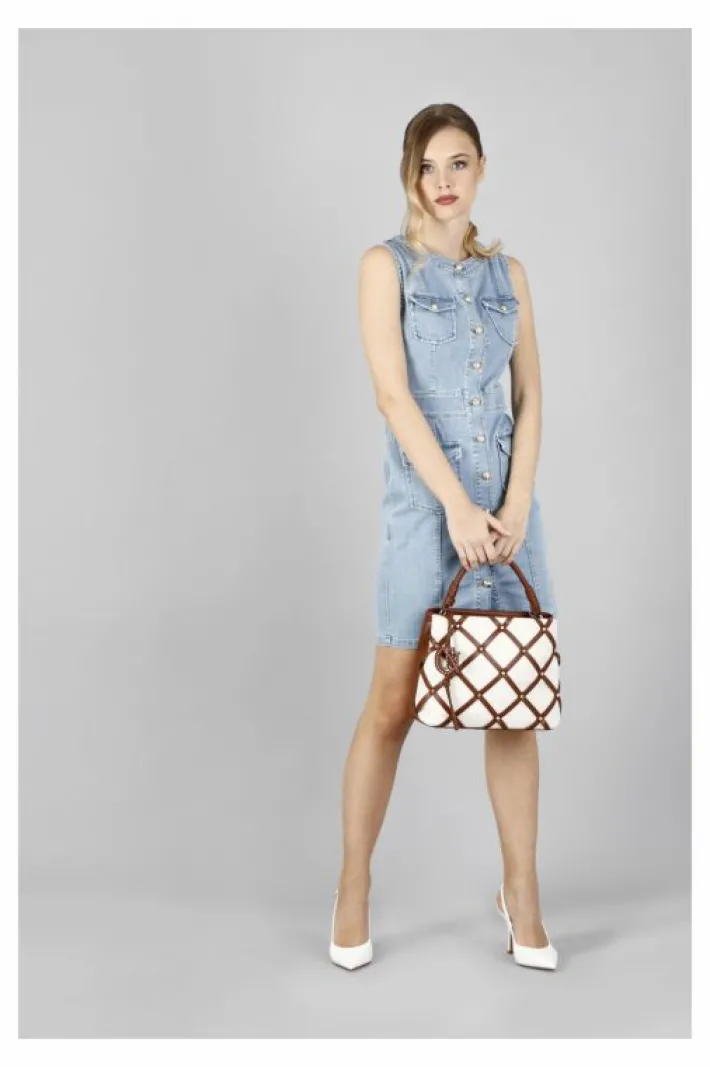 Borsa a secchiello in tessuto con intreccio effetto rete e applicazioni di borchiette dorate. charm con logo effetto cuoio. chiusura con cerniera. borsa dotata di tracolla.