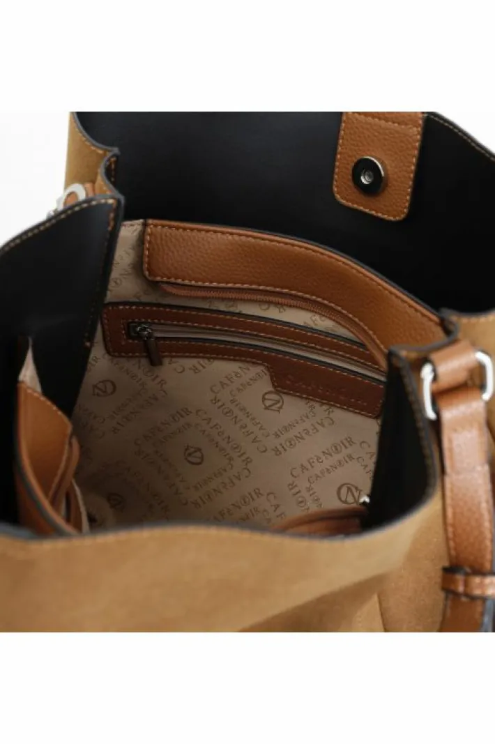 Borsa a spalla in effetto suede con grande lettering sulla tracolla regolabile cafènoir. chiusura con calamita.