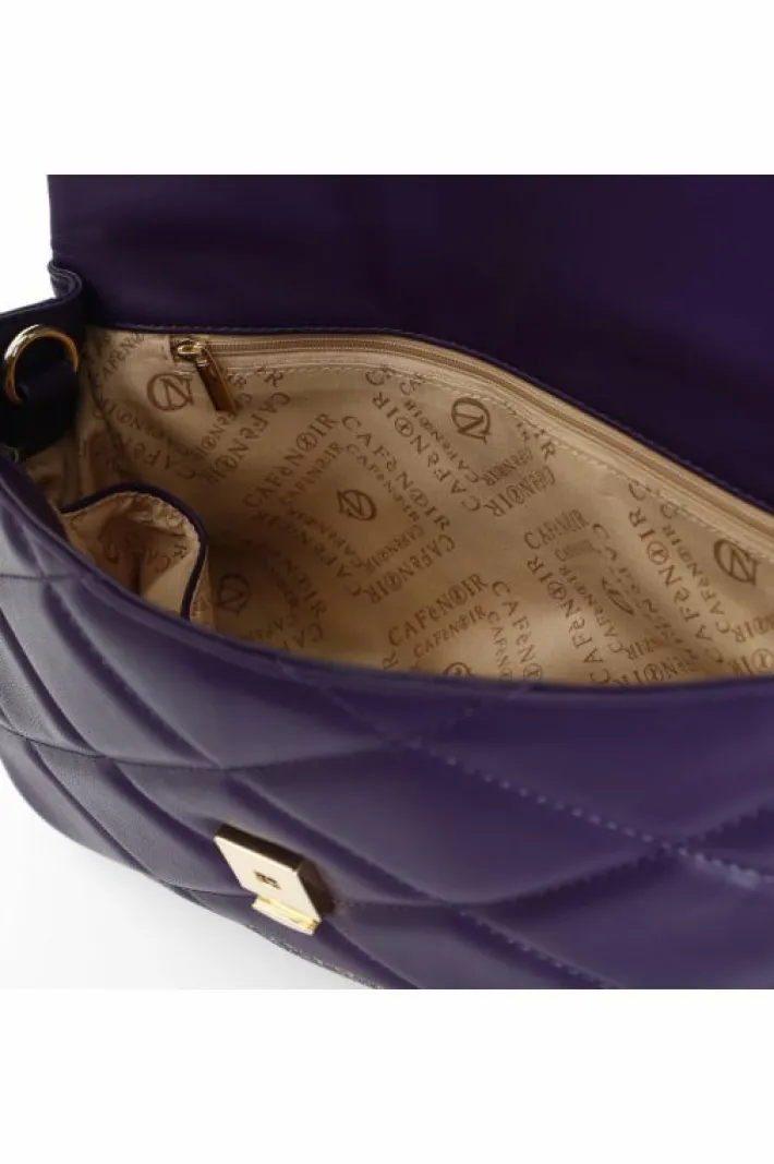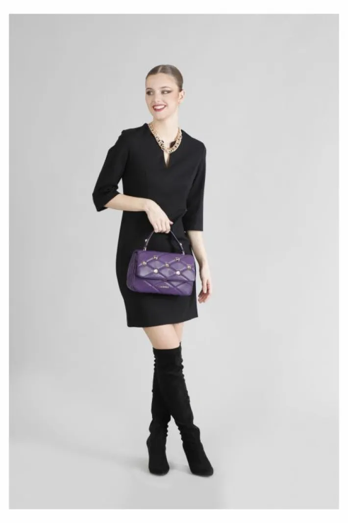 Borsa media modello bandoliera con pattina trapuntata con borchie esagonali e logo ambossed. borsa provvista di unico scomparto di un taschino interno con zip di un taschino portacellulare e di una tracolla. la chiusura è con calamita.