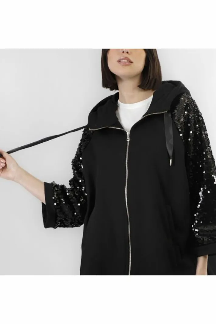 Cappa oversize con pratico cappuccio. realizzata in felpe di cotone.le maniche sono in tessuto di pailettes. questa capo è perfetto in ogni momento della giornata dal lavoro al tempo libero ideale da usare anche come capospalla nei periodi di cambio stagionale.