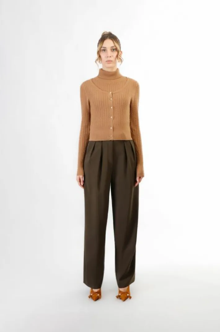 Cardigan corto e aderente con lavorazione di rib e treccia realizzata in filato misto viscosa.chiusura con bottoni. ma…