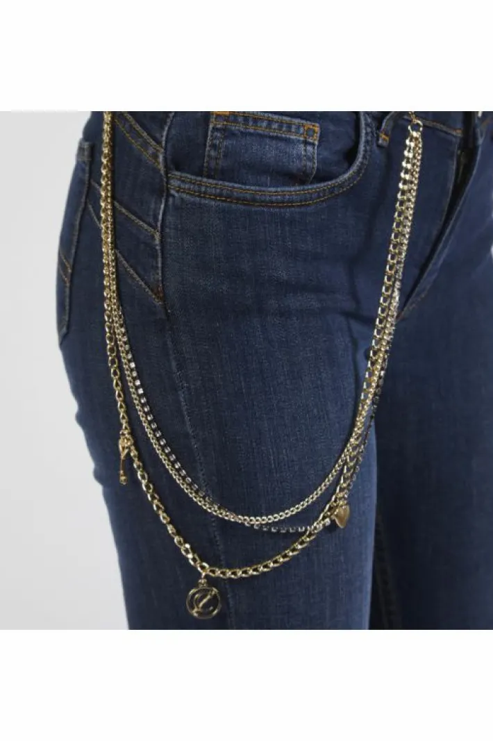 Jeans in tela denim super stretch dalla vestibilità skinny. arricchisce il capo una ricercata catena gioiello personalizzata.