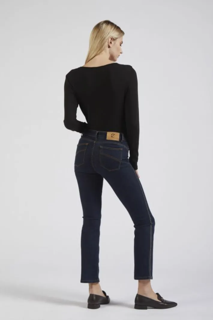 Jeans in tela denim super stretch dallavestibilità slim. applicazione di strass color ambra ai fianchi.