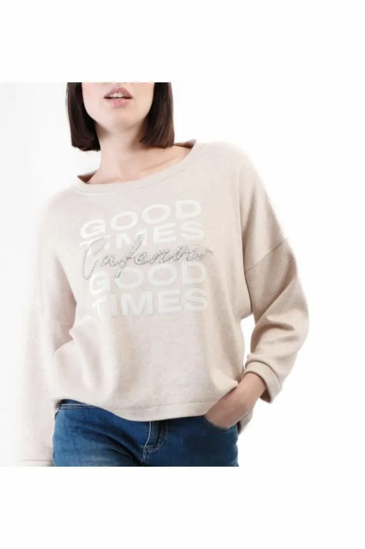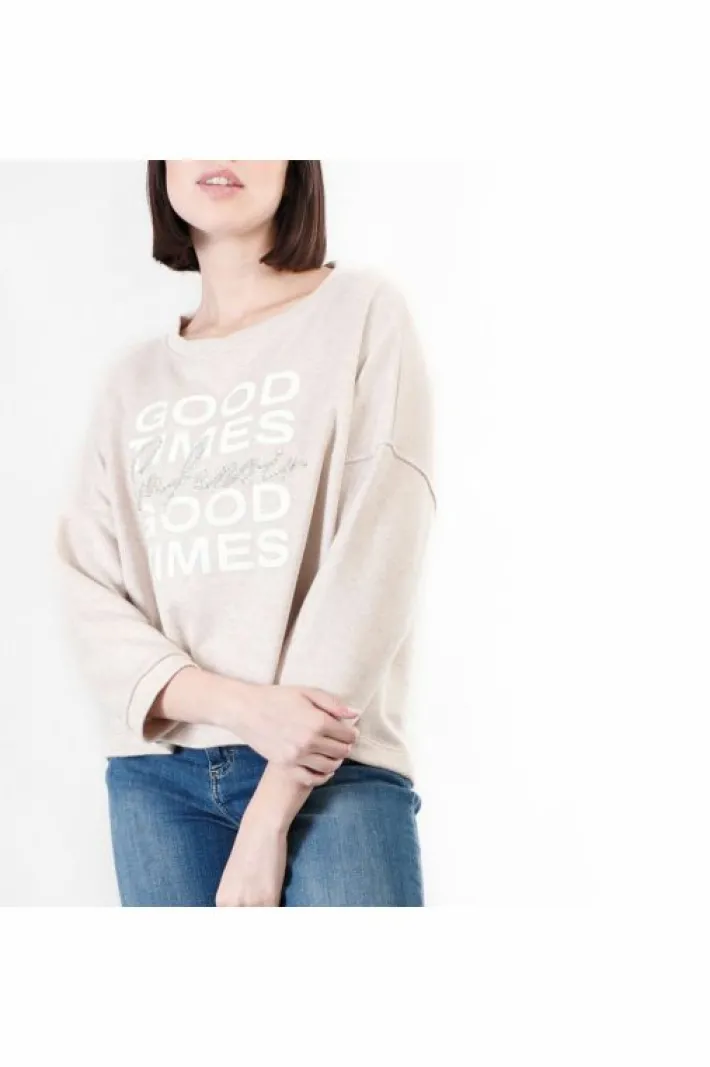 Felpa over dalla mano calda con scollo a barca e manica a pipistrello. stampa floccata e ricco ricamo a mano. capo estre…