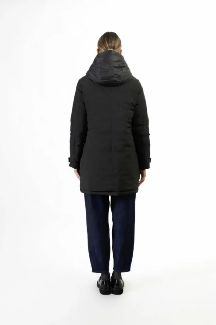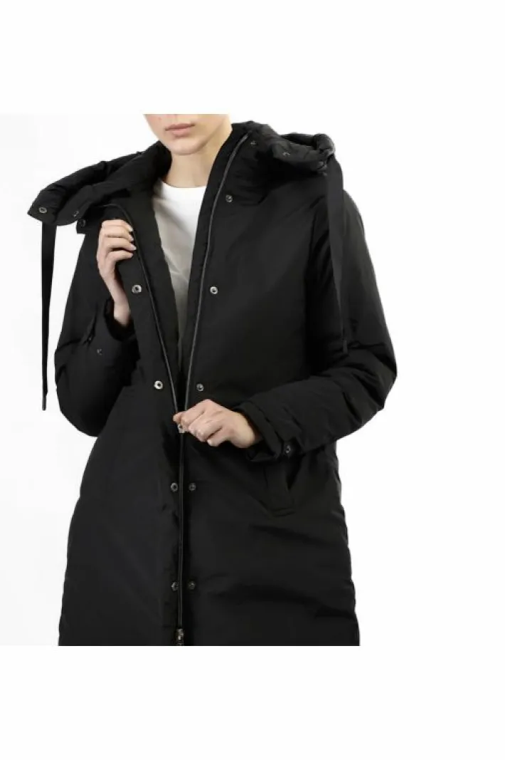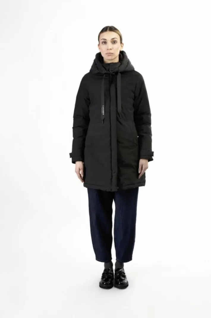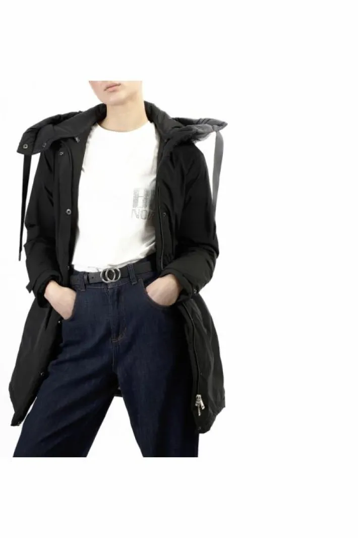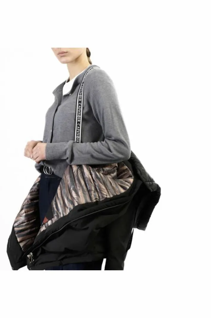Giaccone imbottito realizzato in tessuto tecnico con cappuccio staccabile in tessuto a contrasto. fodera con nostro slogan “be noir” in nylon stampata. presente all’interno una pratica bretella realizzata in nastro jacquard logato che permette di indossare il capo come uno zaino nelle giornate piu calde.