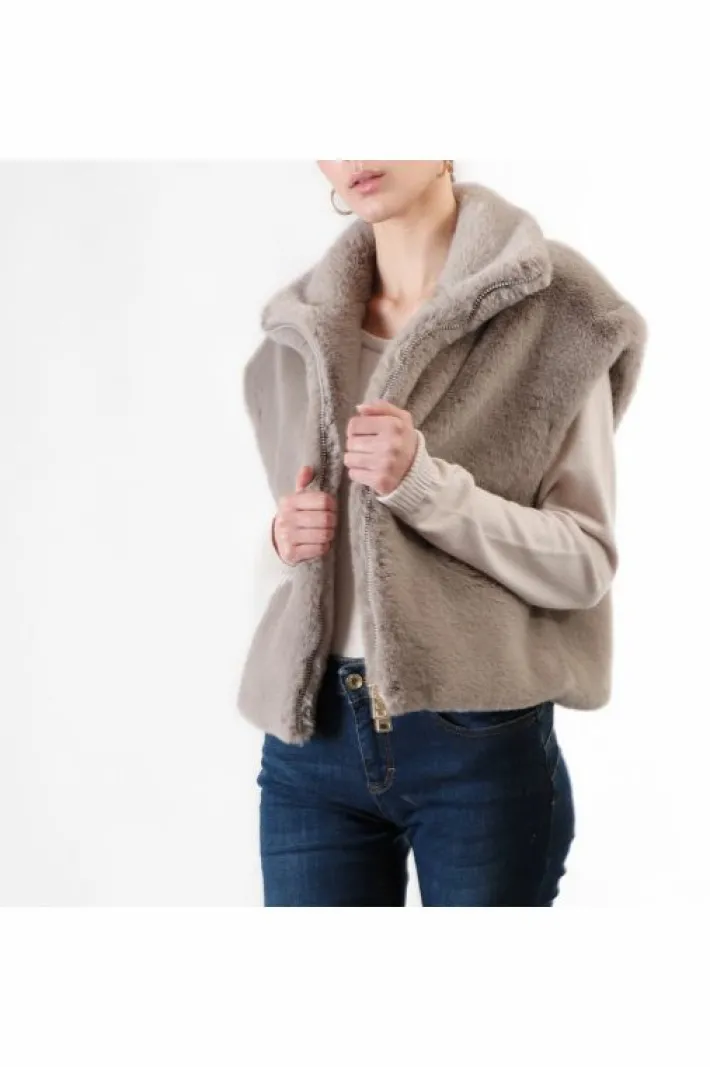 Gilet cropped con spalla scesa realizzato in una soffice similpelliccia tipo rabbit. chiusura con cerniera. capo ideale per creare sovrapposizioni