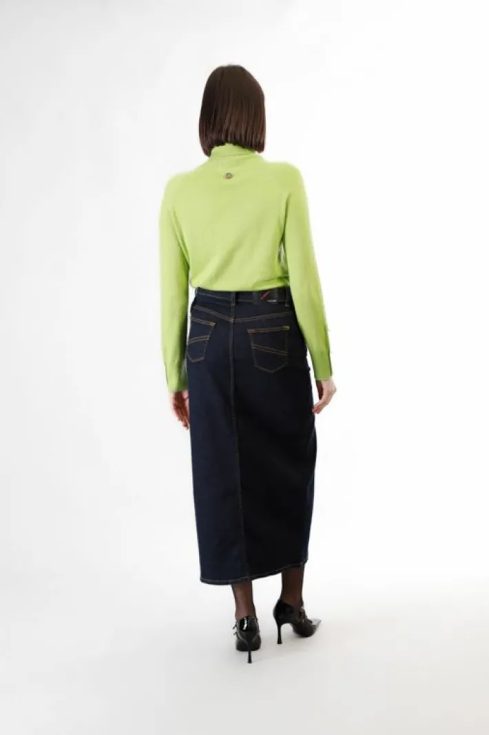 Gonna lunga in denim con spacco frontale. chiusura anteriore con zip e bottone. key look: gonna lunga con un maglione xxl dalle maniche extra.