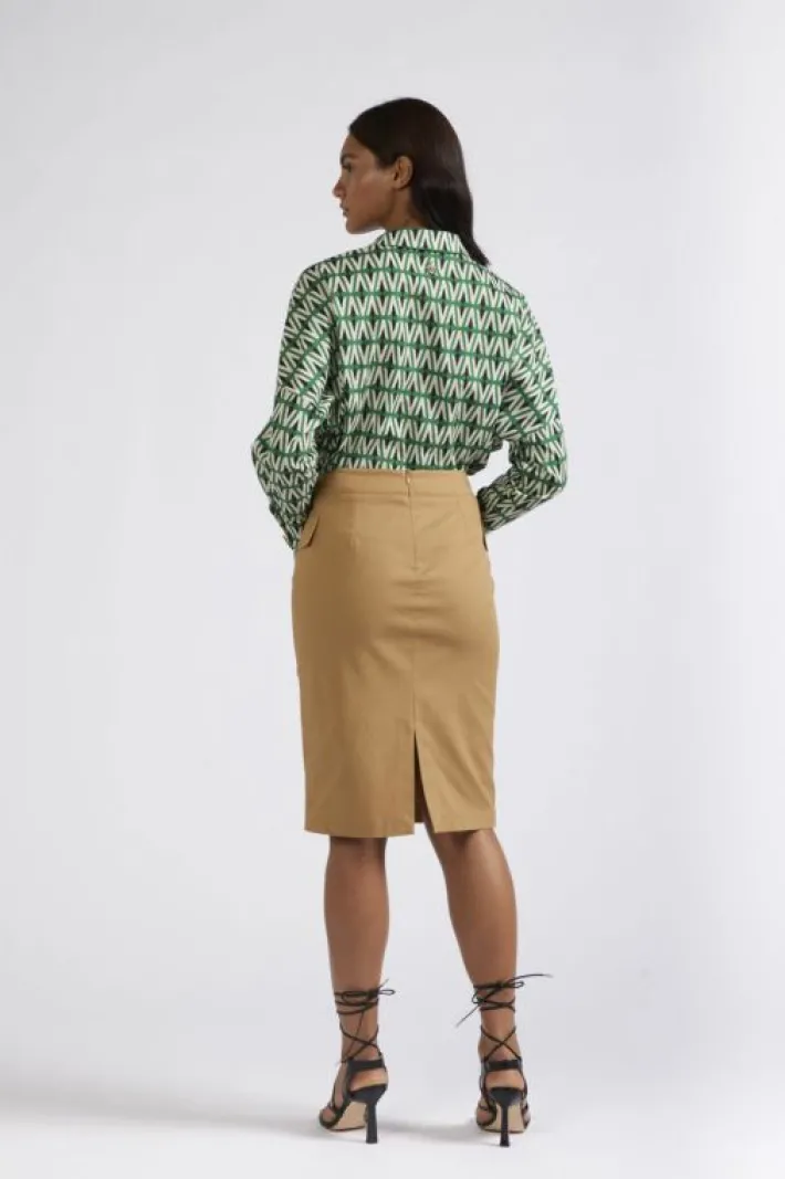 Gonna al ginocchio con tasche a pattina realizzata in cotone elastico. semplice elegante moderna porta raffinatezza al tuo guardaroba di tutti i giorni.