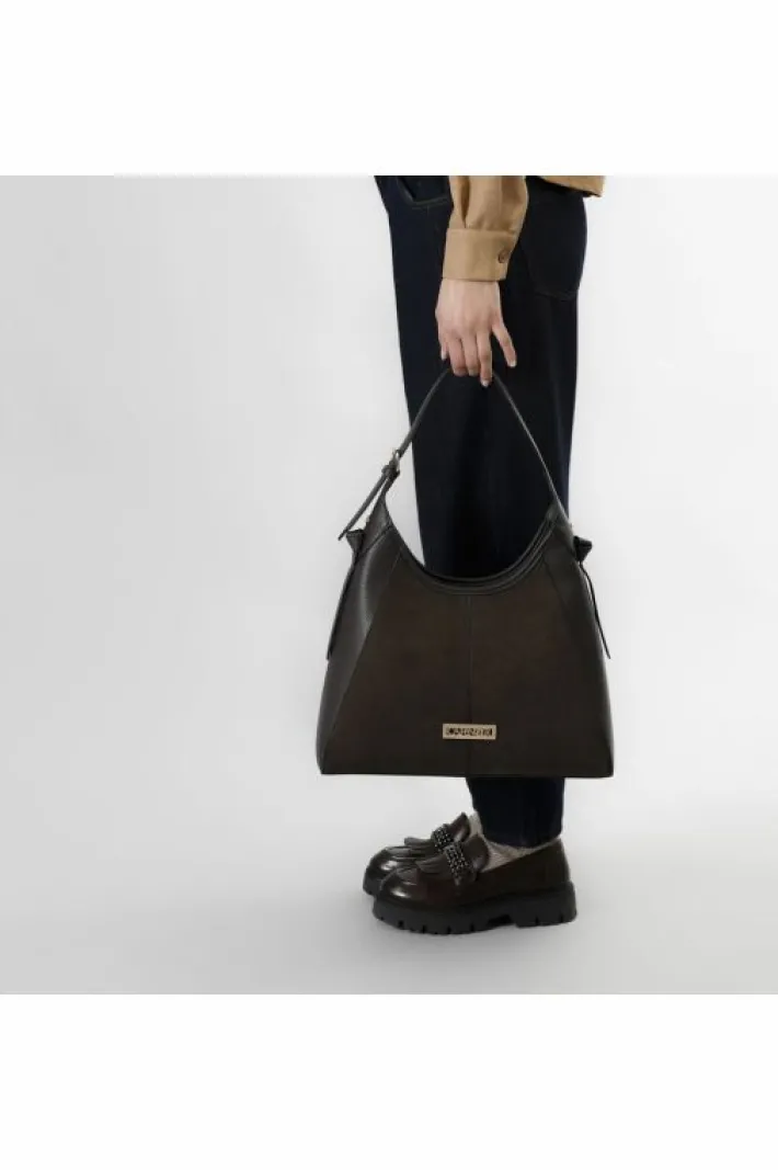 Hobo in materiale granoso ed effetto suede sul quadrante davanti. attacco manici con nodo e placchetta logo in metallo. …