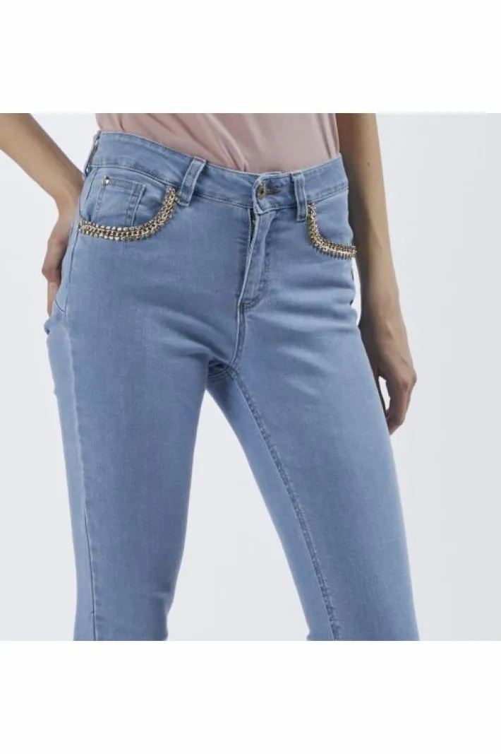 Jeans cinque tasche in tela denim superstretch. catena gioiello alle tasche davanti. vestibilità skinny