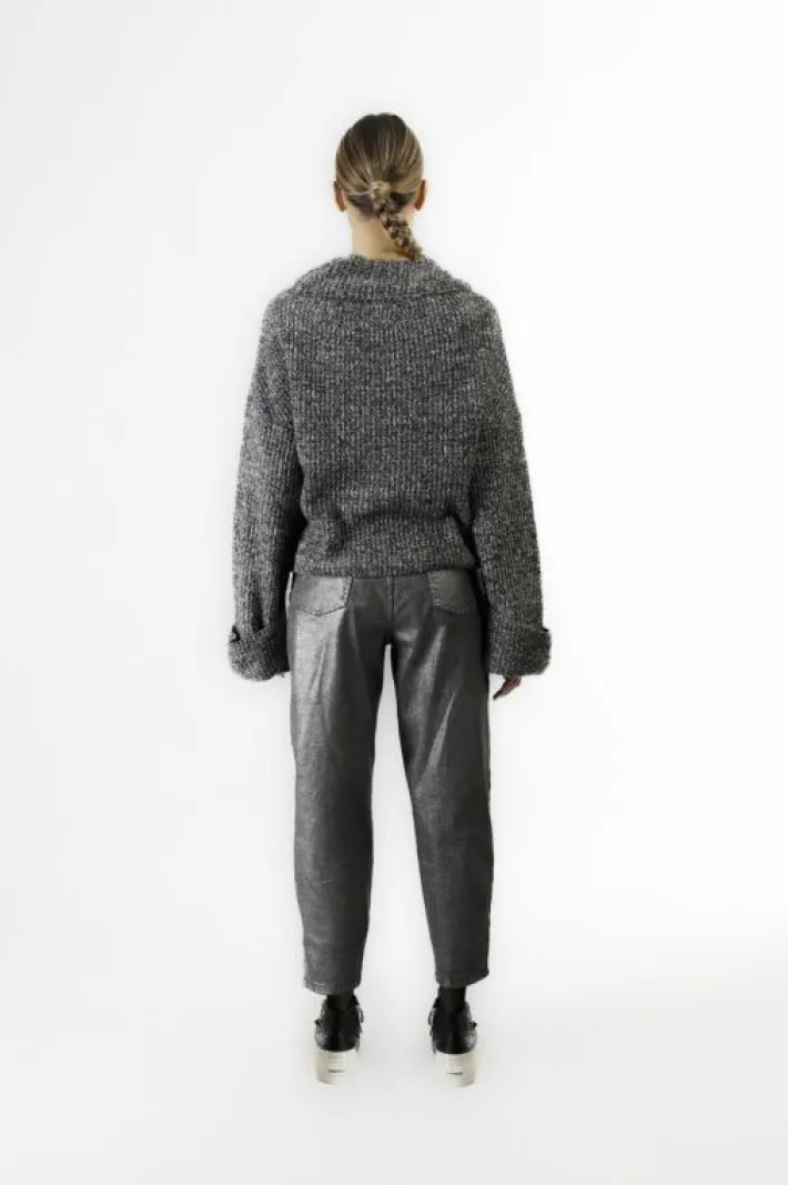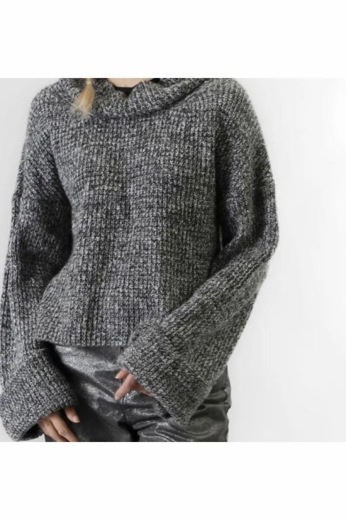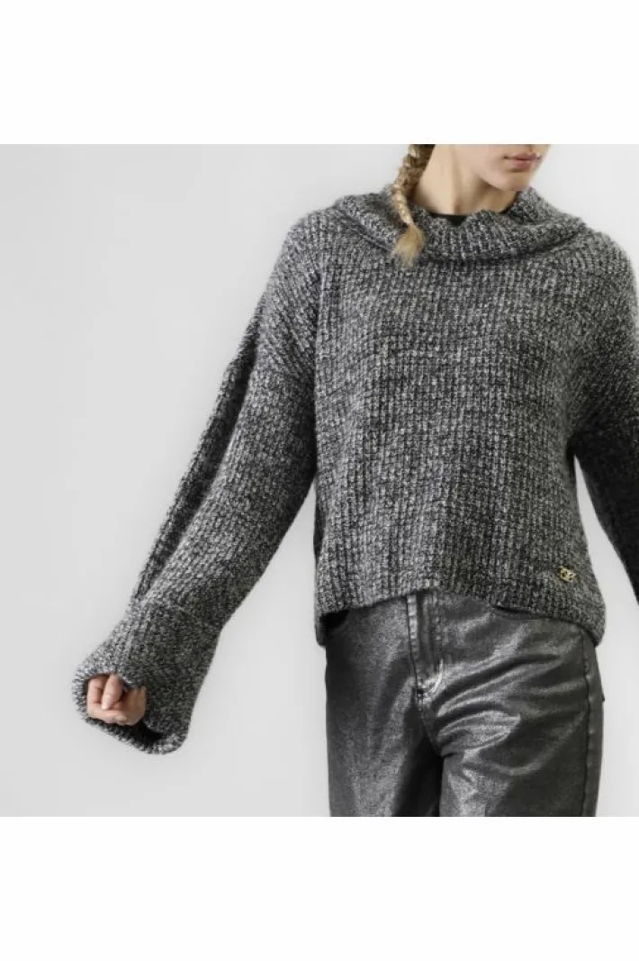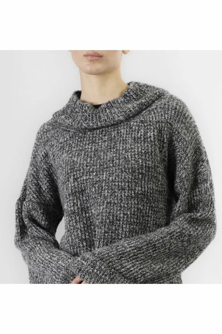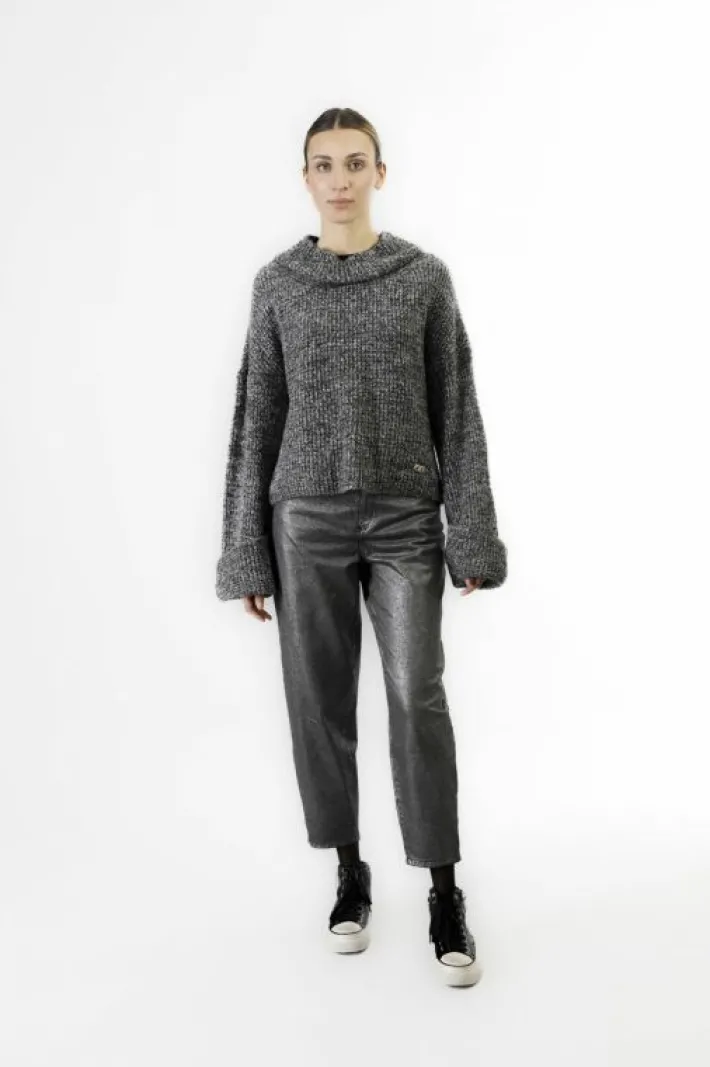 Maglia cropped con collo a ciclista in filato mistolana con lavorazione moulinè. maniche lunghe e a kimono con risvolto danno un tocco di originalità al capo. vestibilità loose fit.
