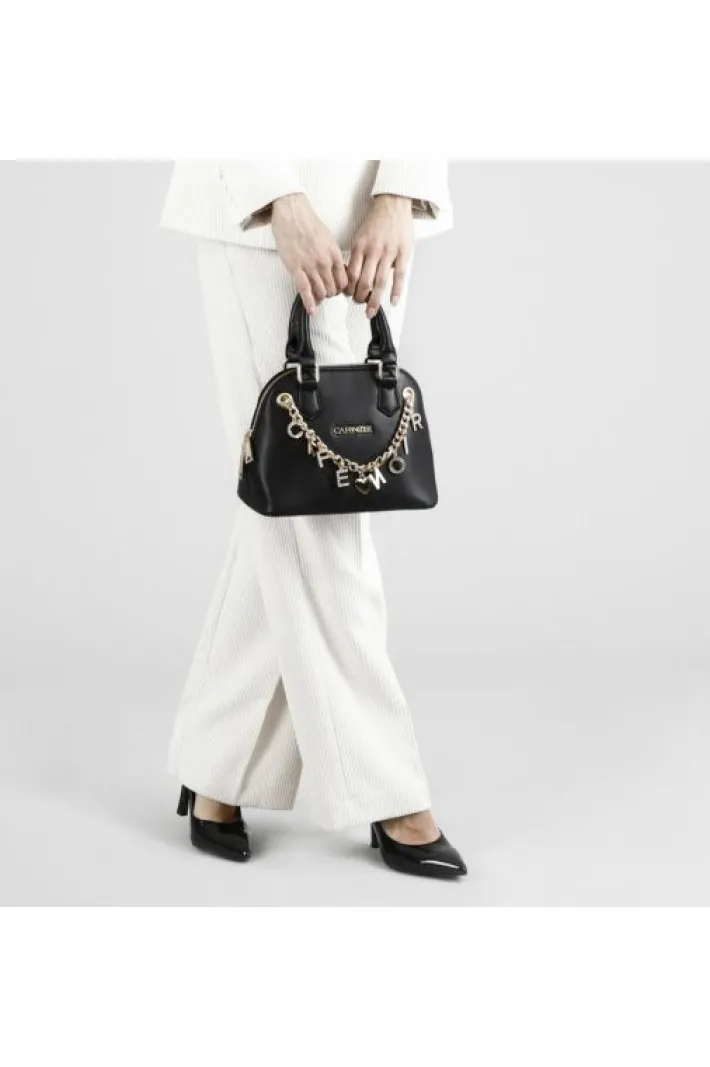 Mini bag da portare a mano oppure a tracolla, impreziosita da una catena con lettere pendenti Cafènoir ricoperte di strass.