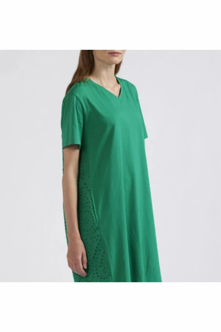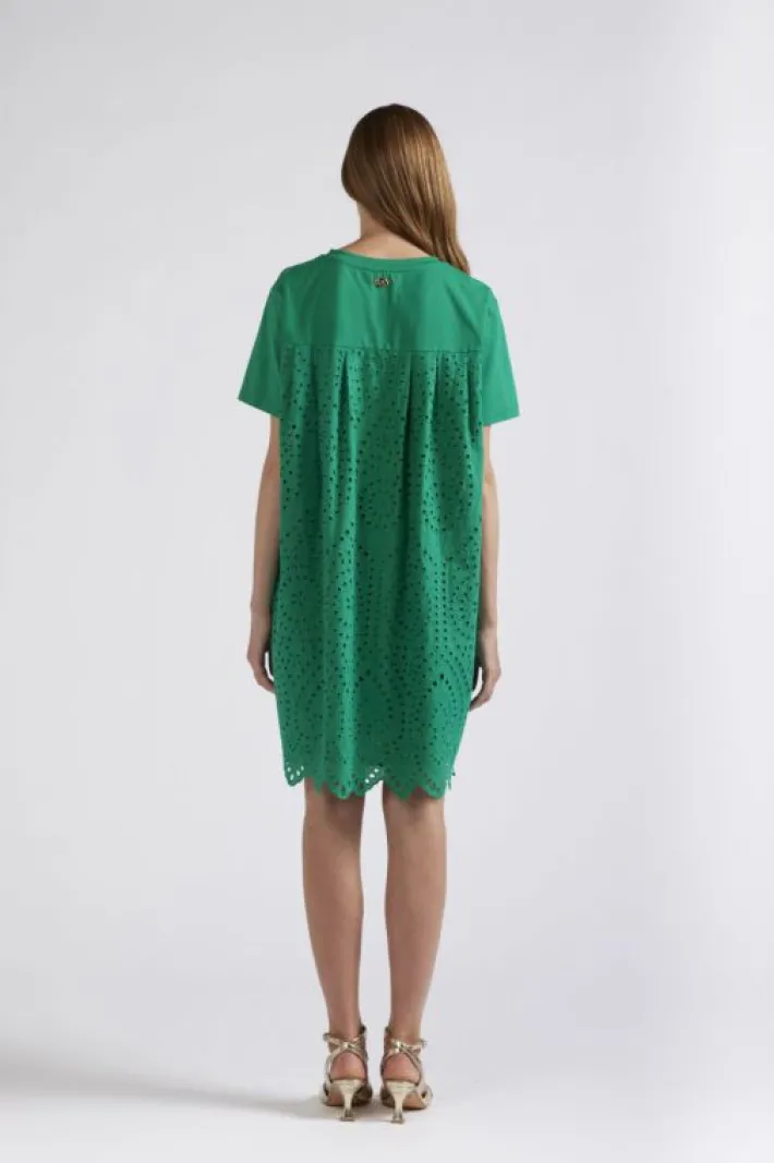 Miniabito bimateriale con il davanti in jersey di cotone e il retro in sangallo. scollatura a “v” e maniche corte. vestibilità comoda.