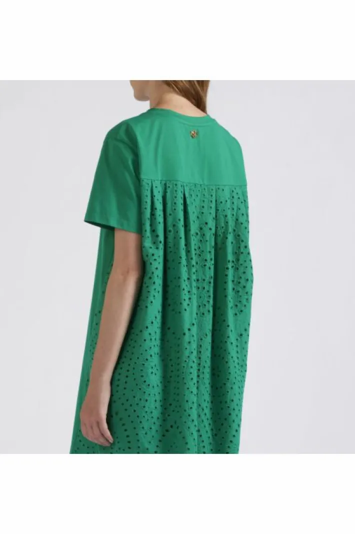 Miniabito bimateriale con il davanti in jersey di cotone e il retro in sangallo. scollatura a “v” e maniche corte. vesti…