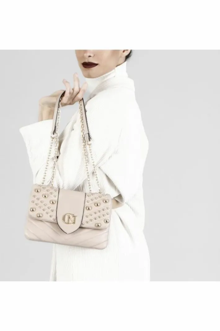 Minibag con pattina trapuntata tempestata da file di borchie semisferiche di diverse dimensioni e accessorio CafèNoir…
