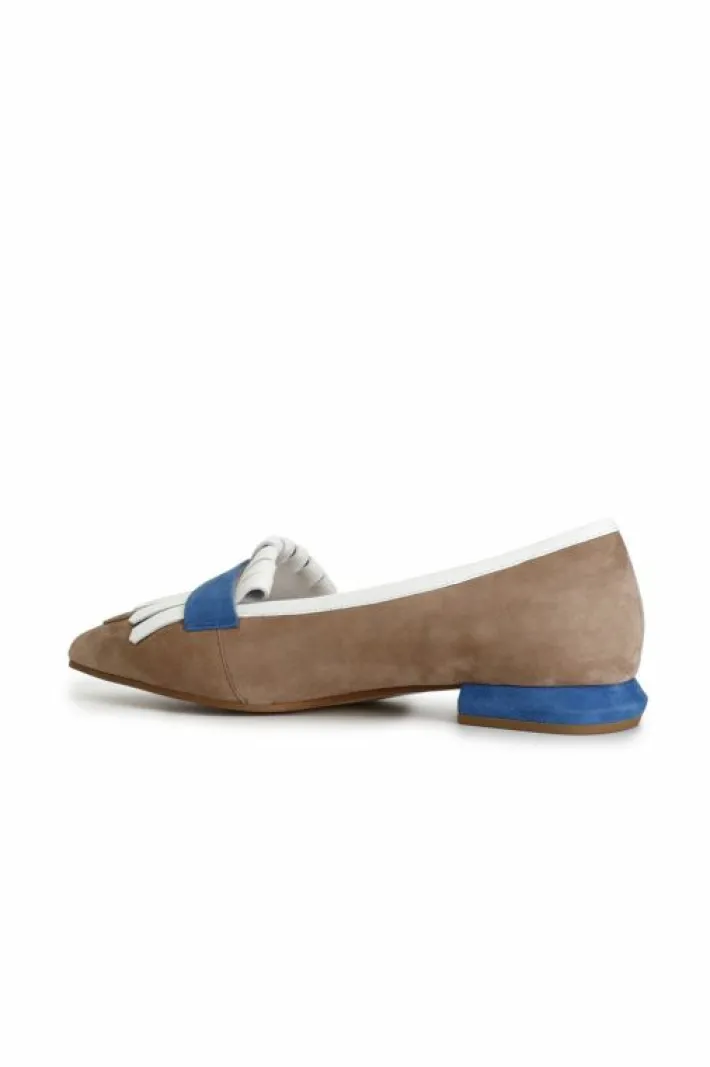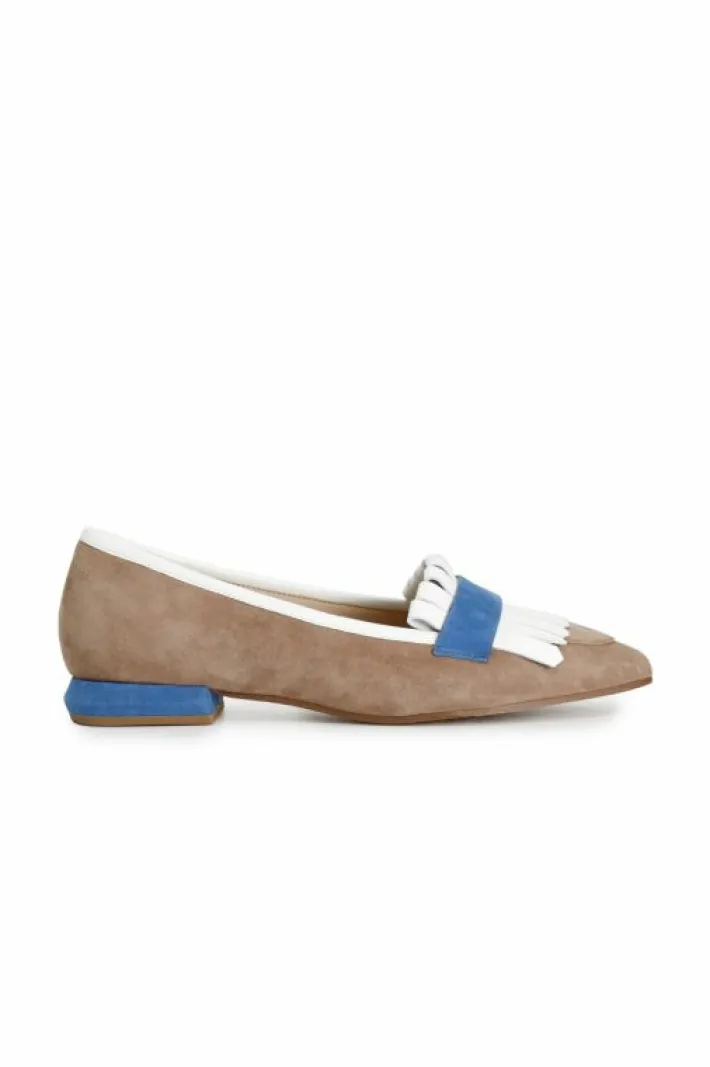 Mocassini in pelle scamosciata con frangia a decoro. tacco fasciato in pelle laminata alto 15mm.