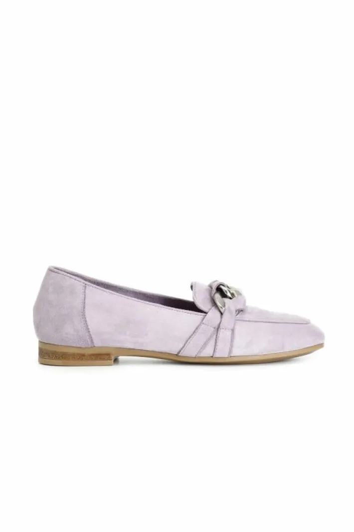 Mocassini donna in pelle scamosciata arricchiti da un morsetto a catena. il soletto è in pelle. tacco alto 15mm. modello versatile e dinamico ideale per completare moltissimi outfit.