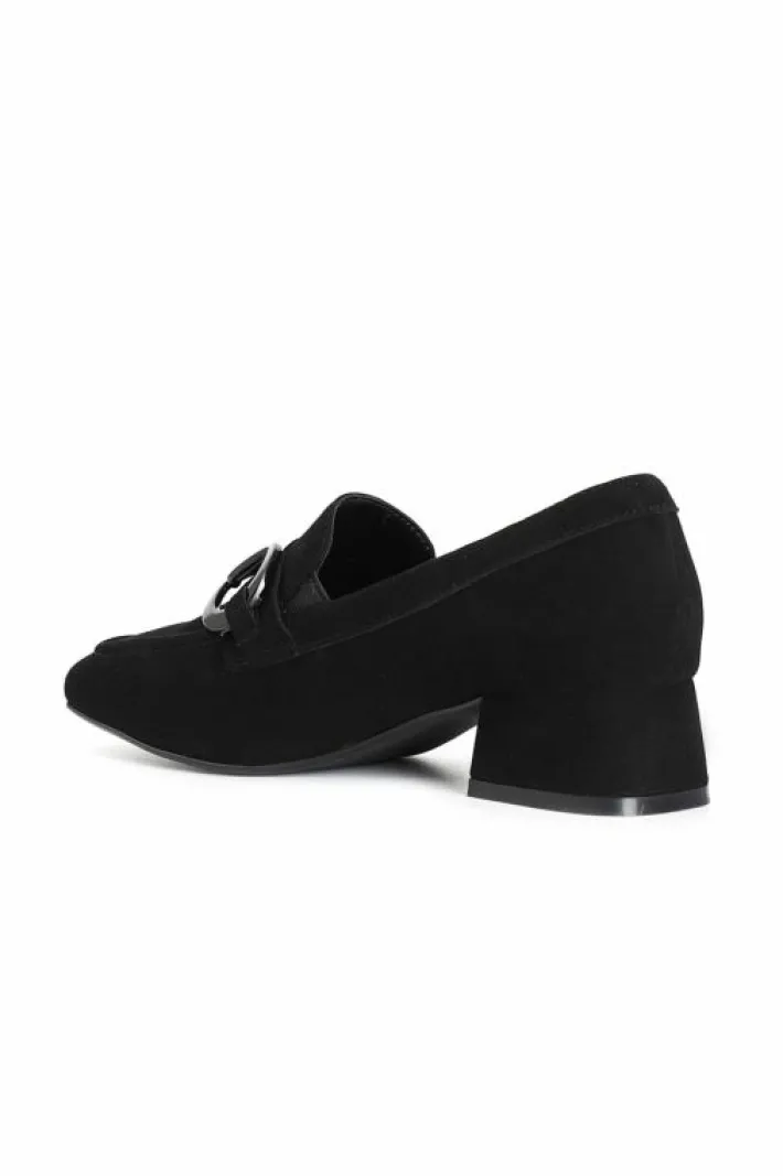 Mocassino da donna in camoscio con morsetto. il soletto è in pelle. tacco spesso 40 mm.