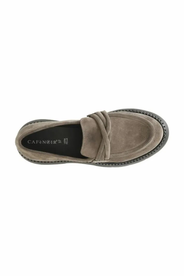 Mocassino da donna in pelle scamosciata con mignon. fodera e soletto sono in pelle. plateau alto 25 mm. tacco da 40 mm.