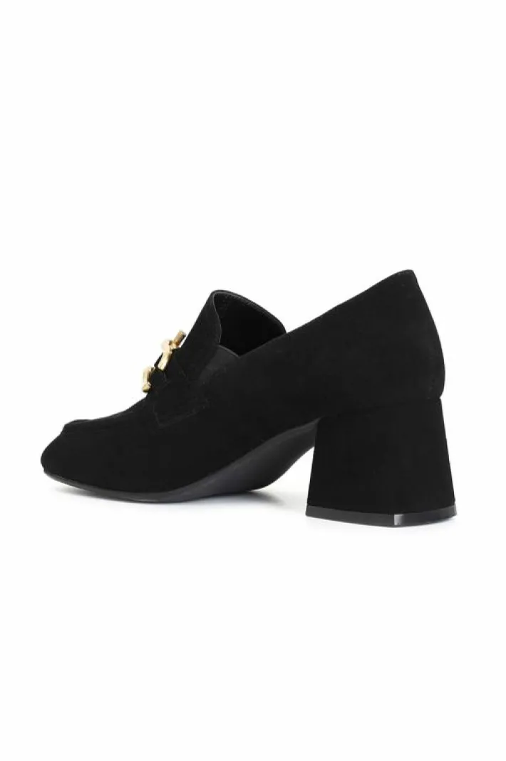 Mocassino da donna in camoscio con accessorio. il soletto è in pelle. tacco spesso 60 mm.