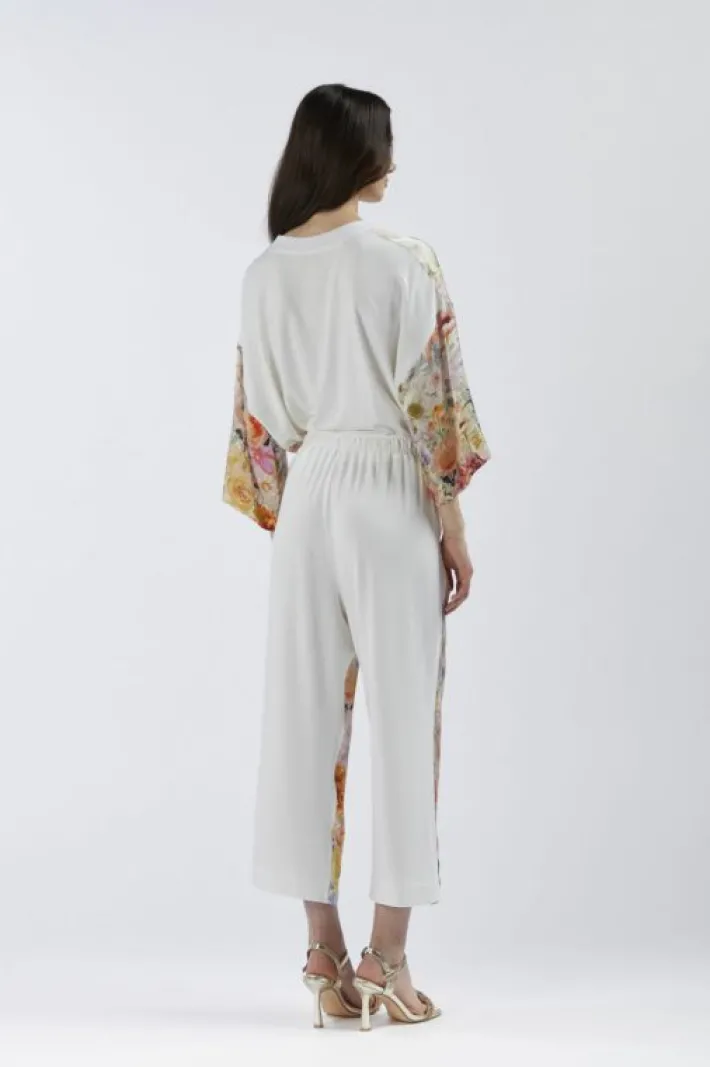 Pantaloni bimateriale tipo jogger con vita elasticata. il davanti è realizzato in un satin di viscosa stampato e il die…