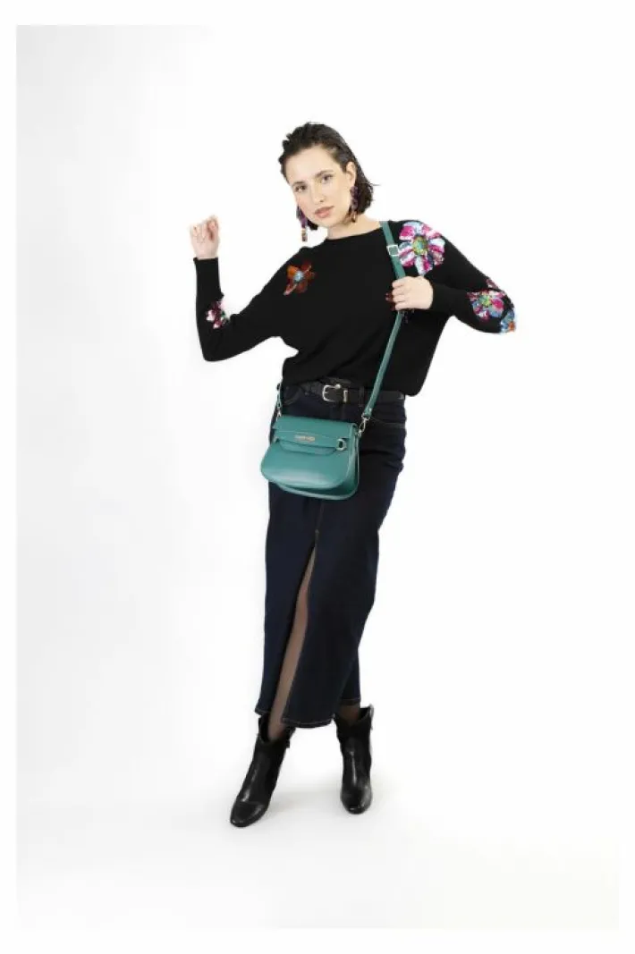 Pattina in pelle con tracolla corta passante con lettering. chiusura con calamita tracolla removibile.