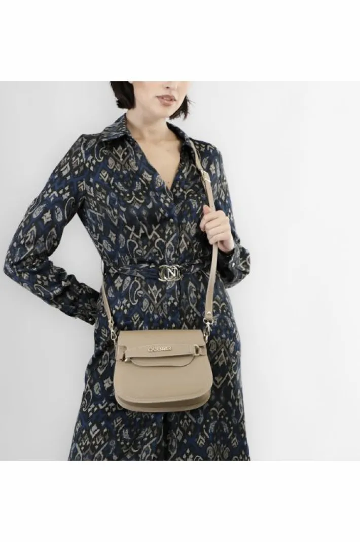 Pattina in pelle con tracolla corta passante con lettering. chiusura con calamita tracolla removibile.