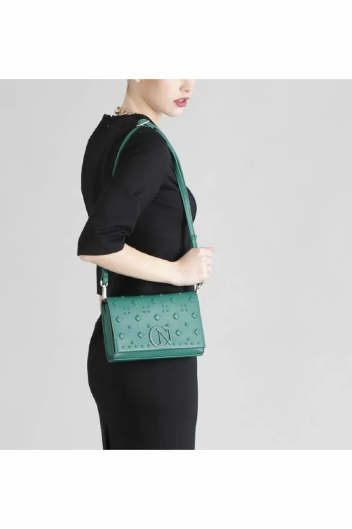 Pochette con logo e borchie a rilievo. pochette provvista di unico scomparto di taschini interno portacarte e di tracolla. chiusura con calamita.