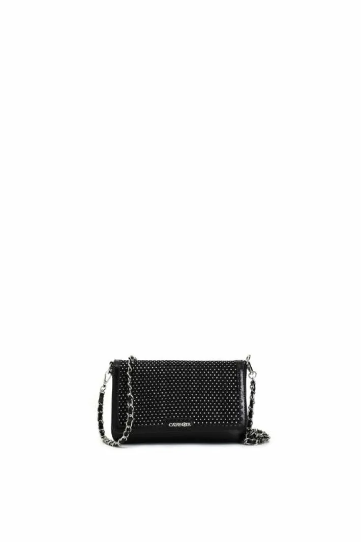 Pochette effetto laminato in rete e strass. tracolla con catena infilatura removibile. chiusura con calamita.