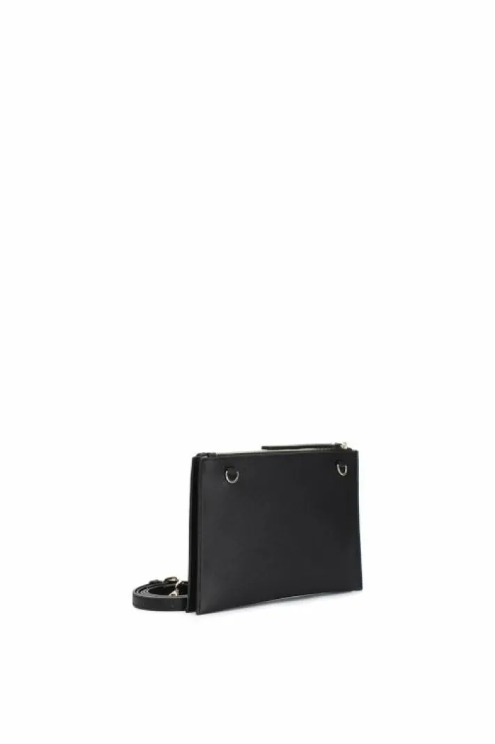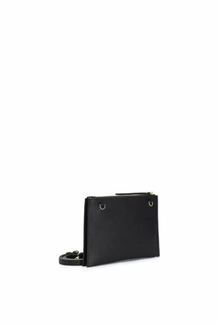 Pochette dalla struttura rigida in saffiano. tiralampo con letterine personalizzate e colorate. chiusura con cerniera. tracolla regolabile.