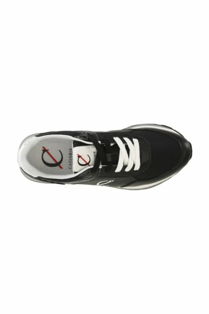 Sneakers da donna con suola running allacciate. calzatura in pelle rivestita e tessuto con riporti effetto shimmer. logo argentato laterale con monogramma cafènoir. altezza suola 30 mm. fussbett interno.