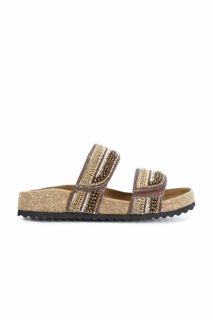 Sandali bassi modello ciabatta con fondo in sughero e fasce regolabili decorate da strass degradè. un incrocio fra lo stile boho e etnico per un’estate all’insegna dello stile