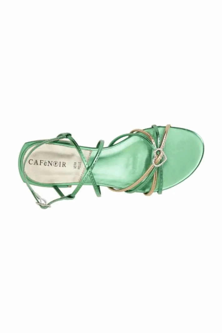 Sandali con multilistini con effetto laminato caratterizzato da un doppio incrocio. accessorio frontale a forma di cuore. comodo soletto imbottito per una calzata morbida. tacco alto 20mm. comodi da indossare e facili da abbinare.