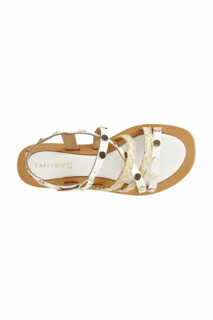 Sandali con fasce in pelle e rafia alternate decorate da borchie dorate.
