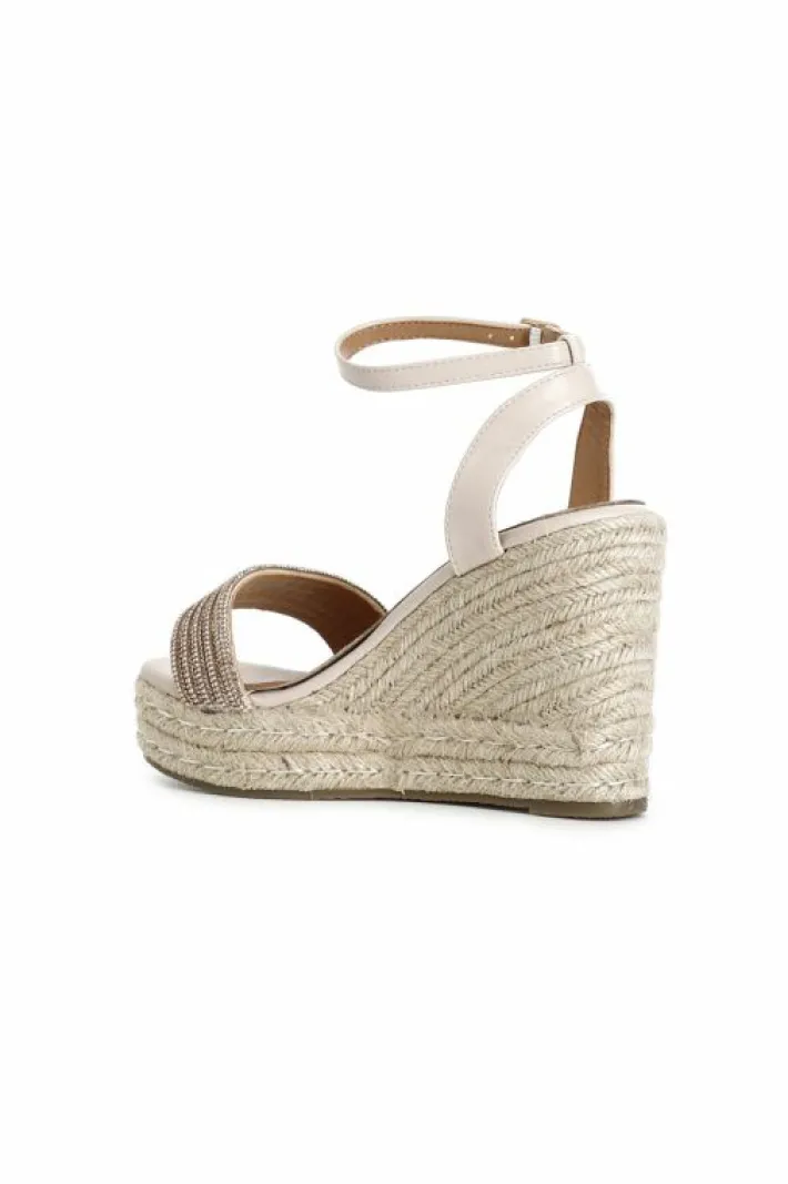 Sandali con fasce strass su zeppa in corda e plateau. cinturino alla caviglia.