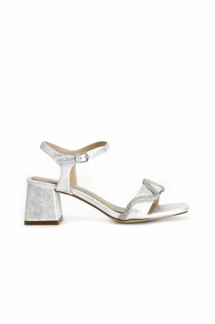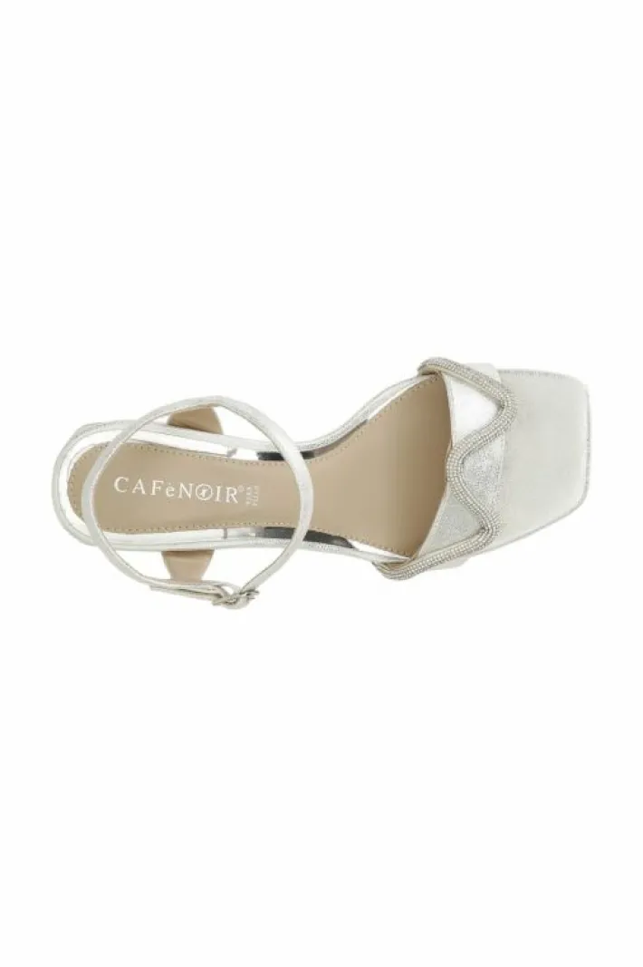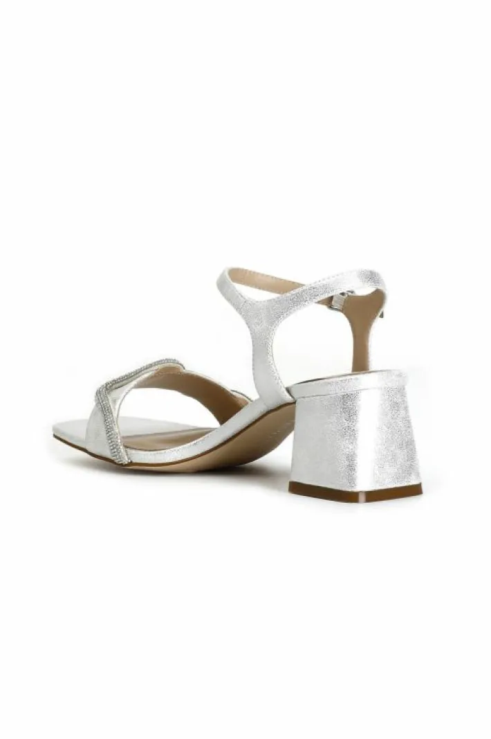 Sandali effetto laminato con dettaglio strass sul davanti. il soletto imbottito in vera pelle fa risultare la calzatura comoda anche dopo svariate ore di utilizzo. il tacco è di 50mm.