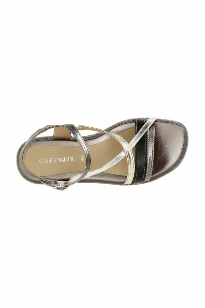 Sandali bassi in similpelle laminata con intreccio multicolore.