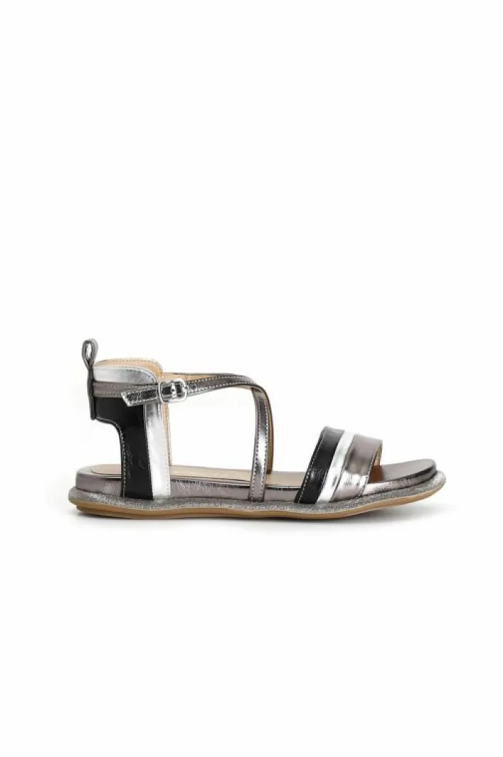 Sandali bassi in similpelle laminata multicolor dai toni pastello. il tallone è scoperto ma sorretto allo stesso tempo da una cornice laterale in similpelle. cinturino alla caviglia.