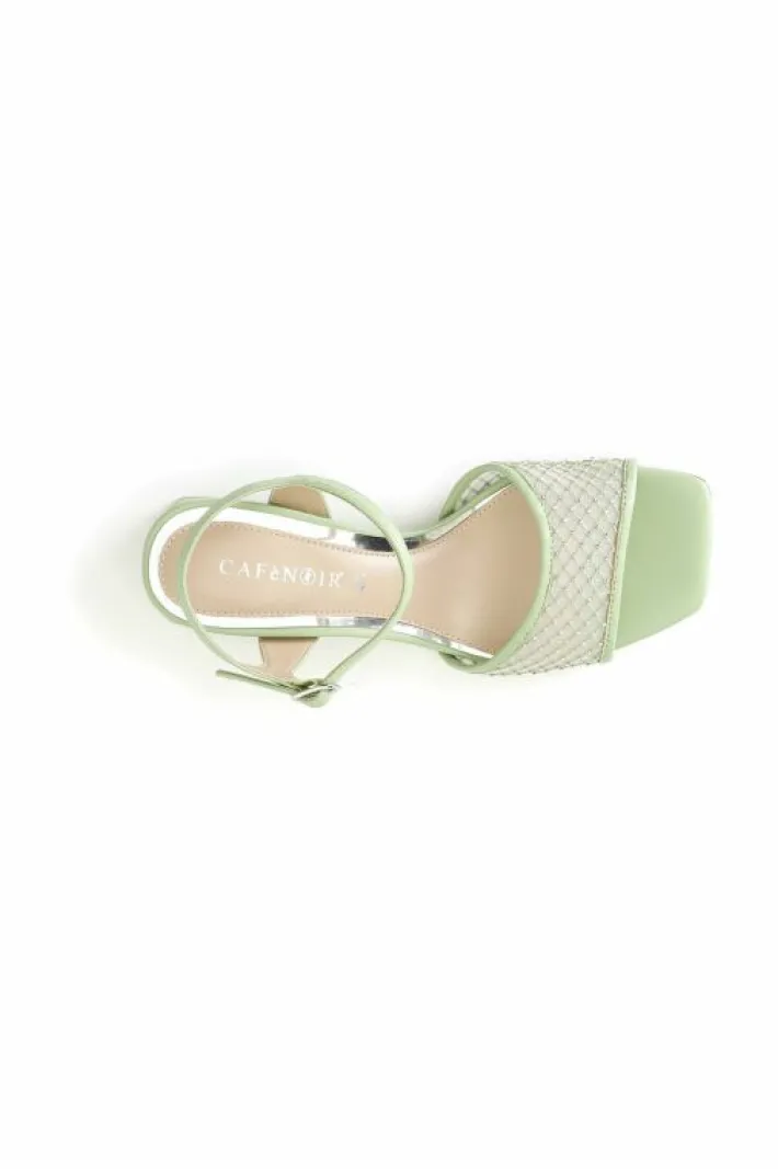 Sandali modello gilda con retina caratterizzata da strass. il soletto imbottito in vera pelle fa risultare la calzatura comoda anche dopo svariate ore di utilizzo. il tacco è di 50mm.