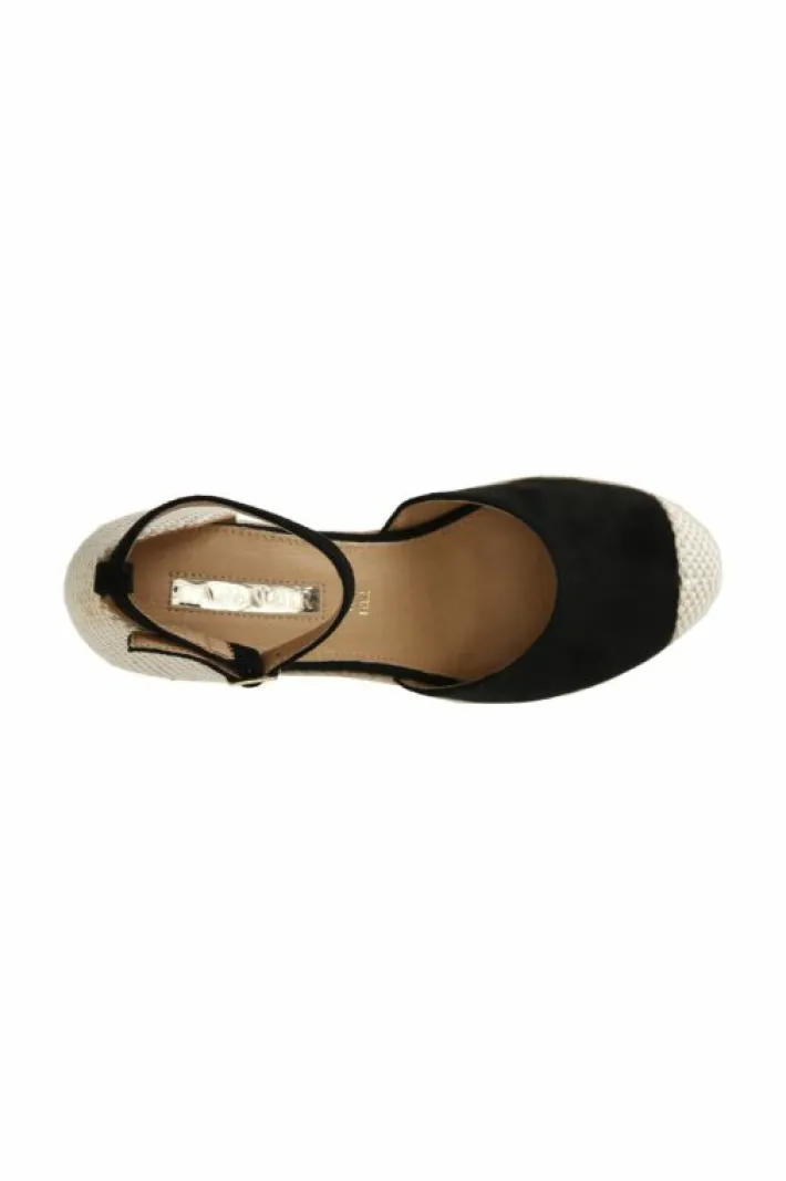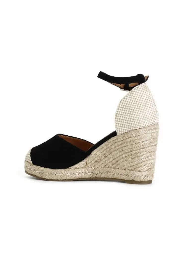 Sandali in tessuto su zeppa in corda. cinturino alla caviglia in tessuto. calzatura chiusa davanti e dietro.