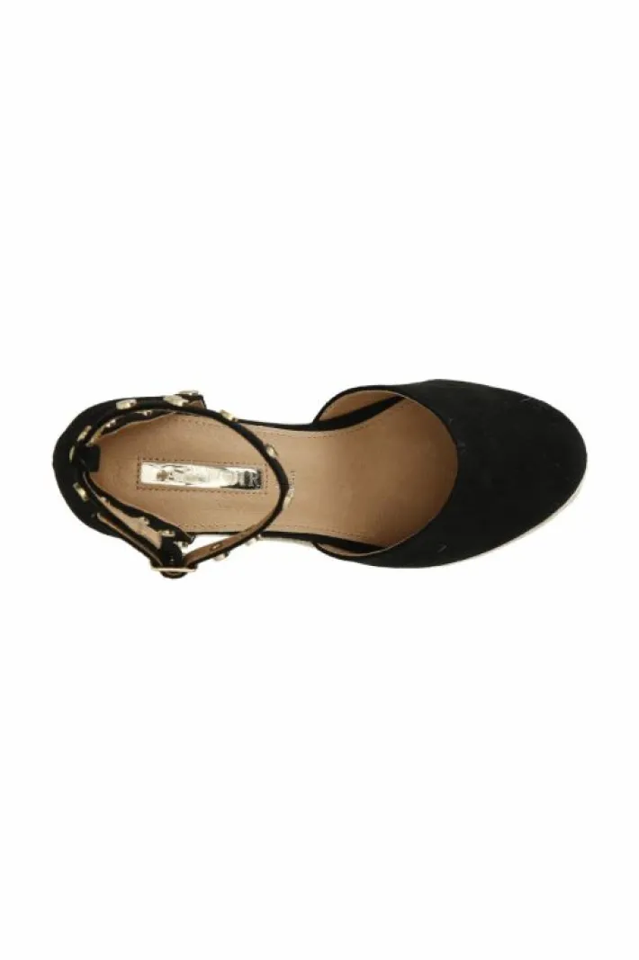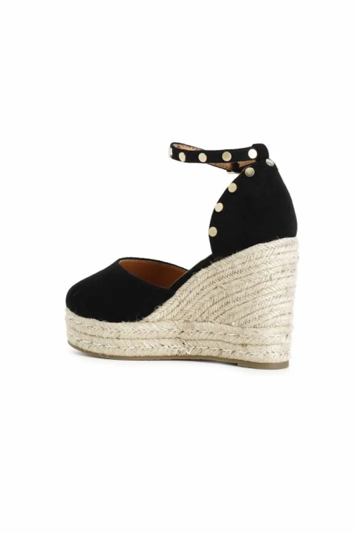 Sandali in tessuto su zeppa in corda e plateau. cinturino alla caviglia in tessuto. calzatura chiusa davanti e dietro. borchie dorate sul toppone e sul cinturino.