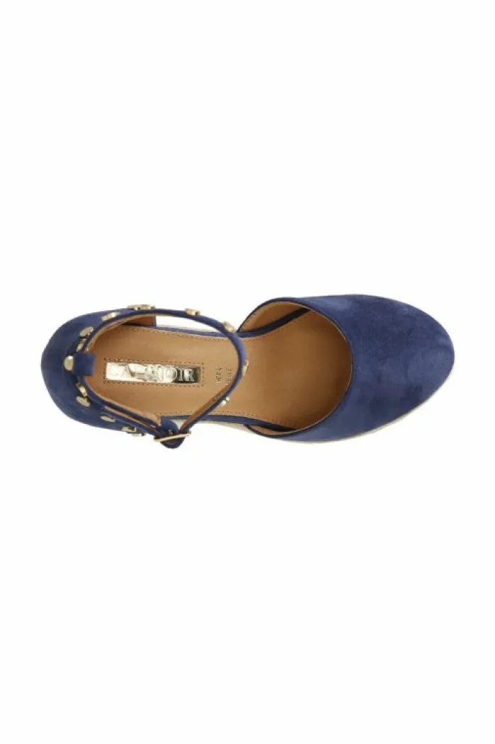 Sandali in tessuto su zeppa in corda e plateau. cinturino alla caviglia in tessuto. calzatura chiusa davanti e dietro. borchie dorate sul toppone e sul cinturino.